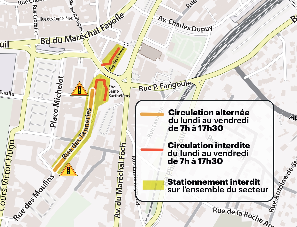 La circulation sera interdite, faubourg des Carmes et faubourg Saint-Barthélemy, sur l'entièreté des voies, chaque jour de 7h à 17h30, hors week-ends,