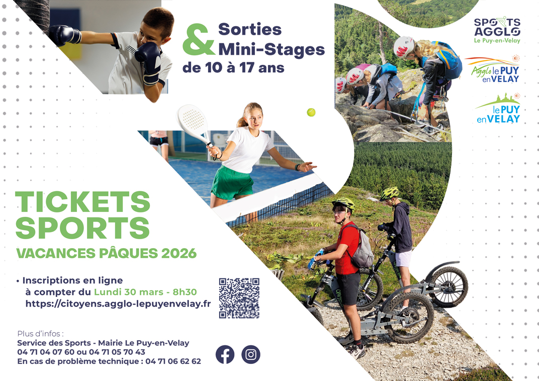 Vivez des vacances sportives avec l’opération « Tickets Sports » ! Les tickets sports sont réservés aux jeunes de 10 à 17 ans, résidant dans l’une des 72 communes de la Communauté d'agglomération du Puy-en-Velay.