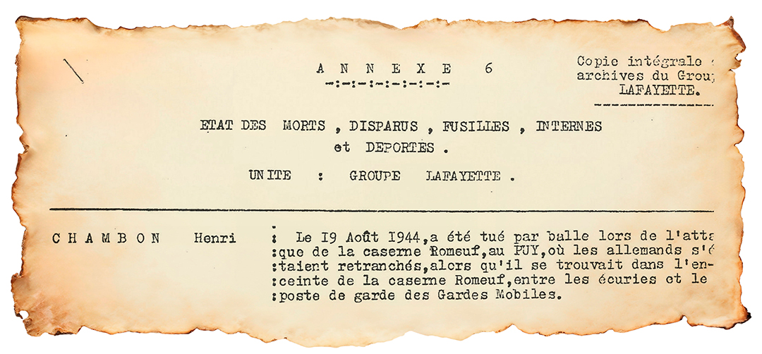 Henri Chambon s’engagea dans le Groupe Lafayette, un corps franc dirigé par Lucien Volle et rattaché aux Mouvements Unis de la Résistance (MUR). En décembre 1943, alors que les nazis, stationnés dans une caserne proche, ordonnèrent de déboulonner la statue en bronze du général Lafayette pour fondre le métal en artillerie, les maquisards décidèrent d’intervenir pour la sauver. La première tentative, consistant à déplacer la statue dans le jardin Henri Vinay, échoua. Quelques jours plus tard, les résistants des groupes Lafayette et Alain réussirent à décrocher la statue, qui pesait une tonne, puis la transportèrent jusqu’à une ferme à quelques kilomètres du Puy-en-Velay. Pour la dissimuler, ils l’enterrèrent sous du fumier de moutons, recouvrant même le bras du marquis qui dépassait, afin de passer inaperçue. Cette opération audacieuse fut un acte fort de résistance symbolique, préservant un emblème local de la destruction allemande. La statue fut finalement remise à sa place d’origine en 1945, lors d’une grande fête célébrant la libération.
