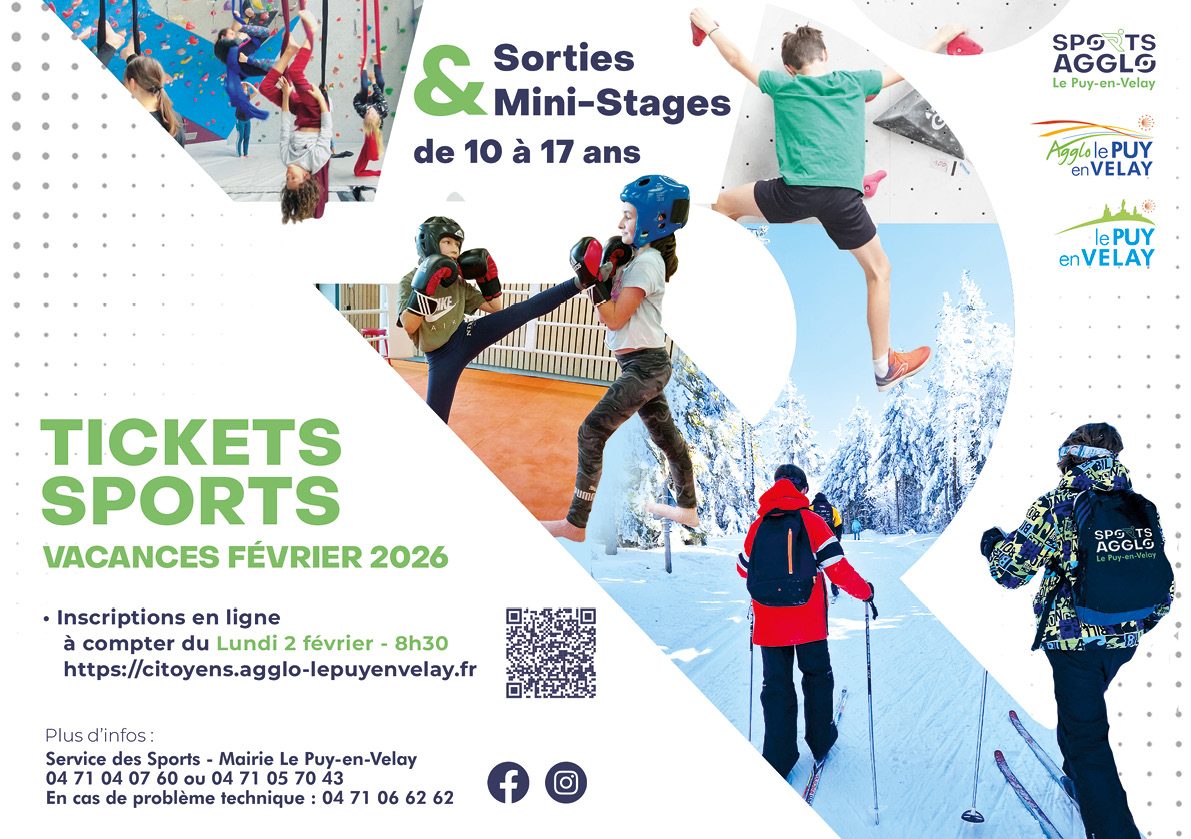 Vivez des vacances sportives avec l’opération « Tickets Sports » ! Les tickets sports sont réservés aux jeunes de 10 à 17 ans, résidant dans l’une des 72 communes de la Communauté d'agglomération du Puy-en-Velay.